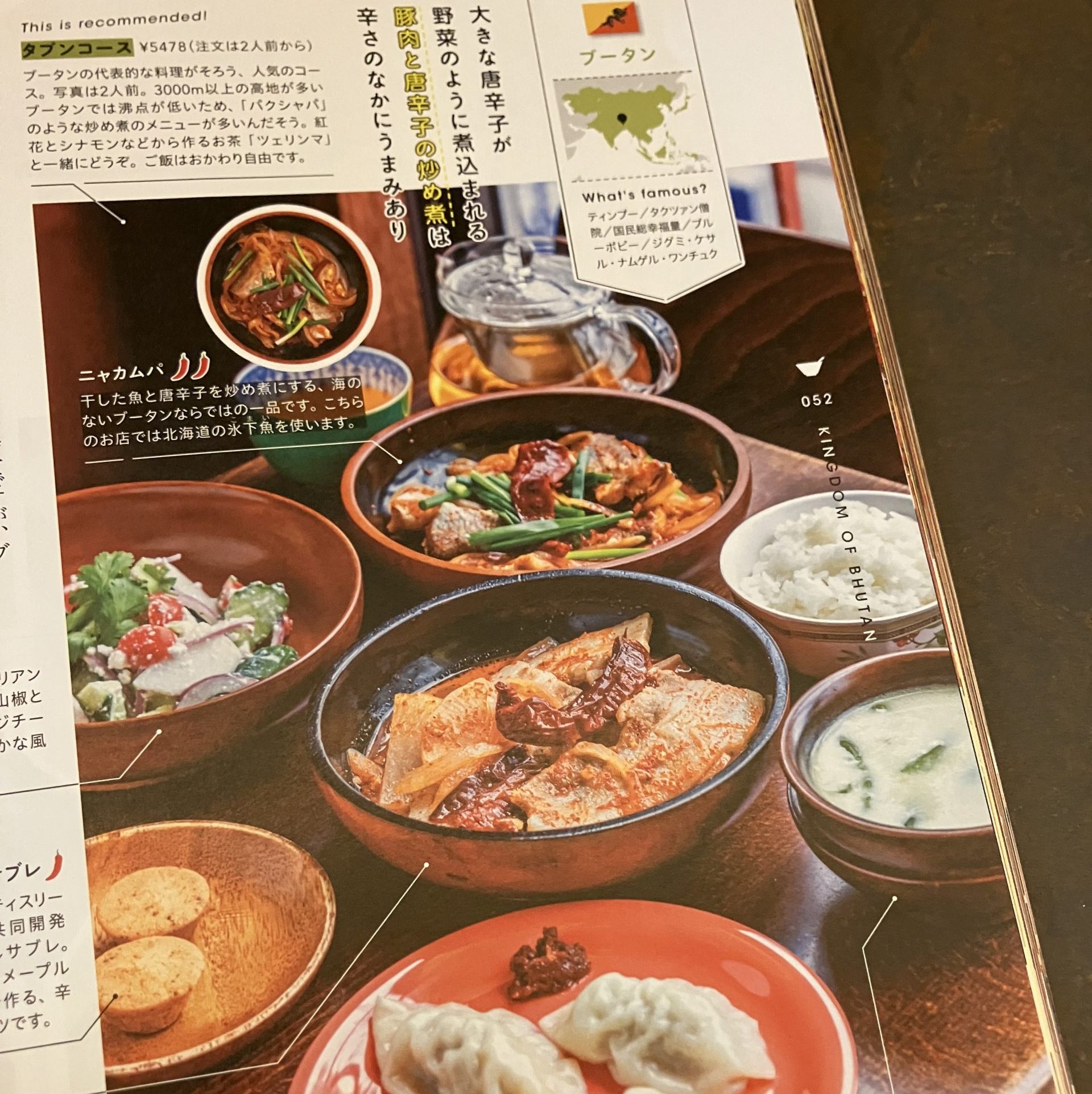 昭文社ムックより発売中の「東京にいながら世界一周⁉︎おいしいものめぐり」にガテモタブンのブータン料理も掲載していただきました。